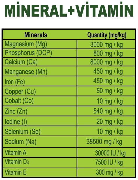 Kullanım amacı : Her cins ve yaştaki hayvan gruplarının vitamin, mineral ve tuz ihtiyaçlarını karşılamak için üretilmiştir. Verimli bir et-süt